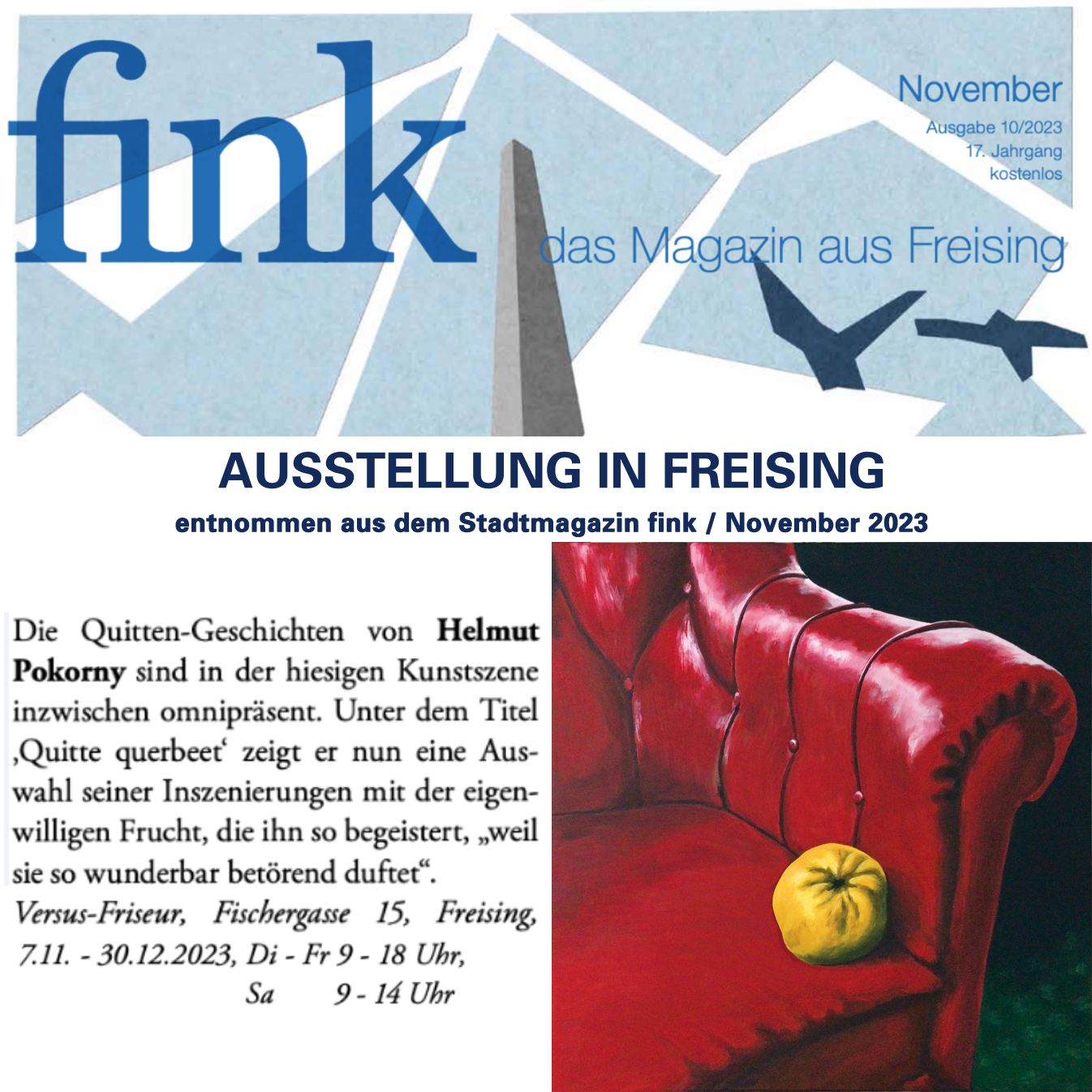 Das Freisinger Stadt- und Kulturmagazin „fink“ schreibt dazu von einer „Omnipräsenz in der hiesigen Kunstszene.“ Die letzte Ausstellung für heuer findet beim Versus-Frisör in der Fischergasse in Freising statt. Und wieder ist mein großes Thema die Welt der Quitte, eine never-ending Faszination. Schauen wir, was das nächste Jahr bringt!