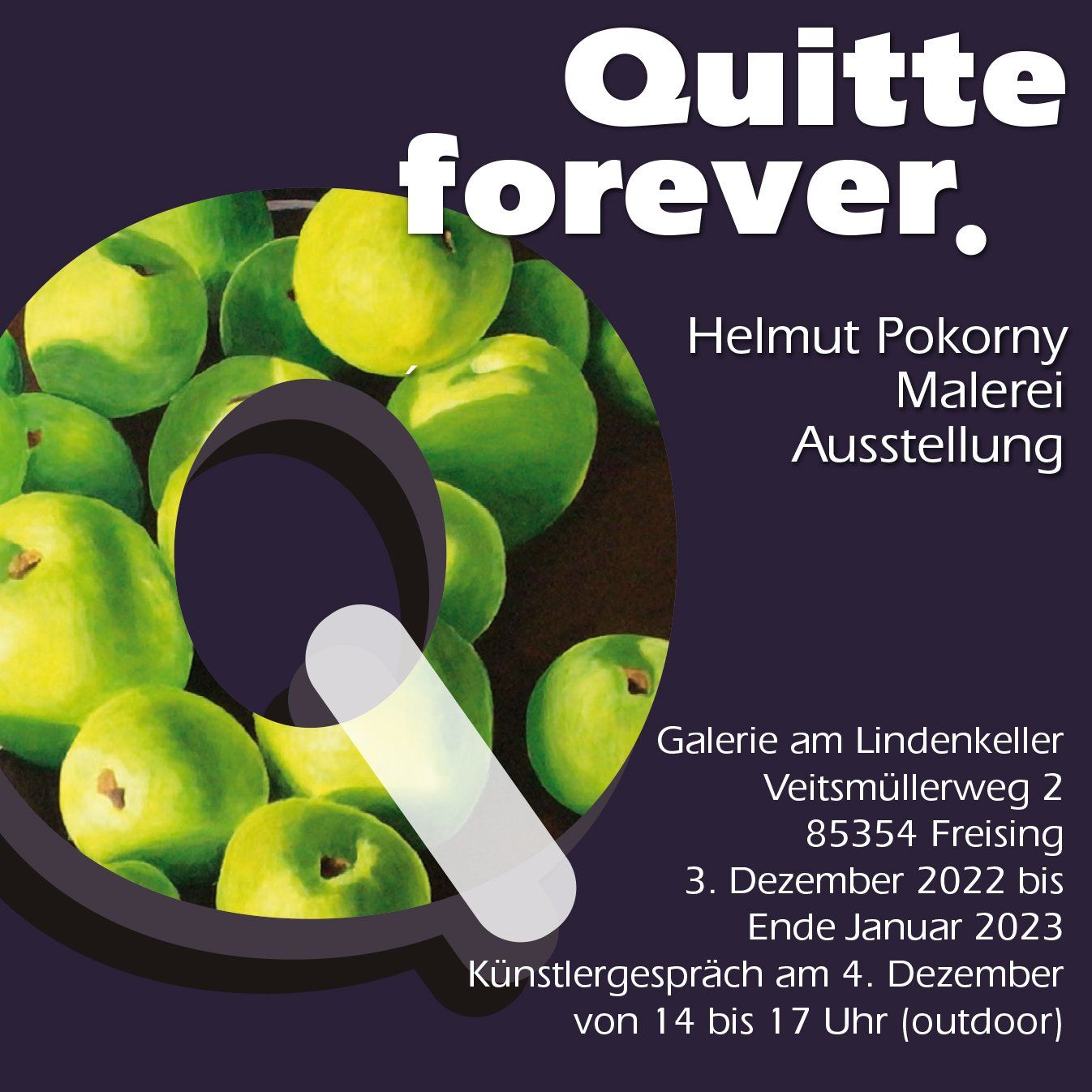 Quitte forever. Die Galerie am Lindenkeller in Freising ist Schauplatz einer noch nie gezeigten Quittenparade. Quitten in allen Facetten, Situationen und Entwicklungsstadien. Die Gemälde sind konkret, lassen aber viel Raum für Fantasie und eigene Assoziationen. Am 4. Dezember von 14 bis 17 Uhr gibt es „Talk mit Heli”. Ich freue ich mich auf Ihren/Euren Besuch. Die Bilder werden dort bis Ende Januar 2023 gezeigt.