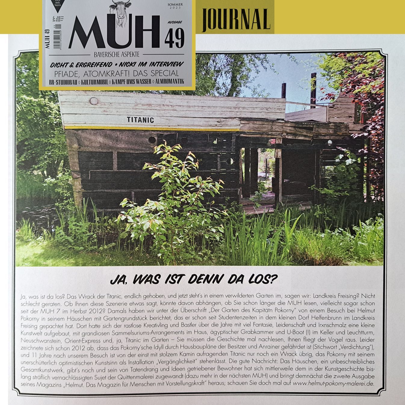 … fragt das bayerische Magazin MUH in seiner 49. Ausgabe. Und erinnert an die berühmte Ausgabe 7 von 2012, wo in einem hinreißenden ellenlangen Artikel über den „Zaubergarten des Kapitän Pokorny“ ausführlich berichtet wurde. Das Gesamtkunstwerk ist immer noch zu bewundern, wenngleich mit einigen Abstrichen, der Vergänglichkeit geschuldeten Abbauten. Diese Lücke hat jetzt die Quittenmalerei eingenommen.